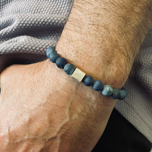 Armband Lapislazuli „Selbstbewusst S(t)ein“ mit Sterling Silber Würfel, 8 mm Perlen