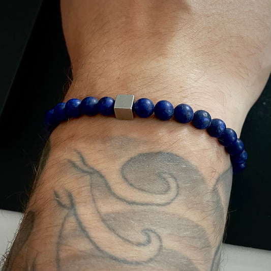 Armband Lapislazuli „Selbstbewusst S(t)ein“ mit 6 mm Perlen und Edelstahl Würfel