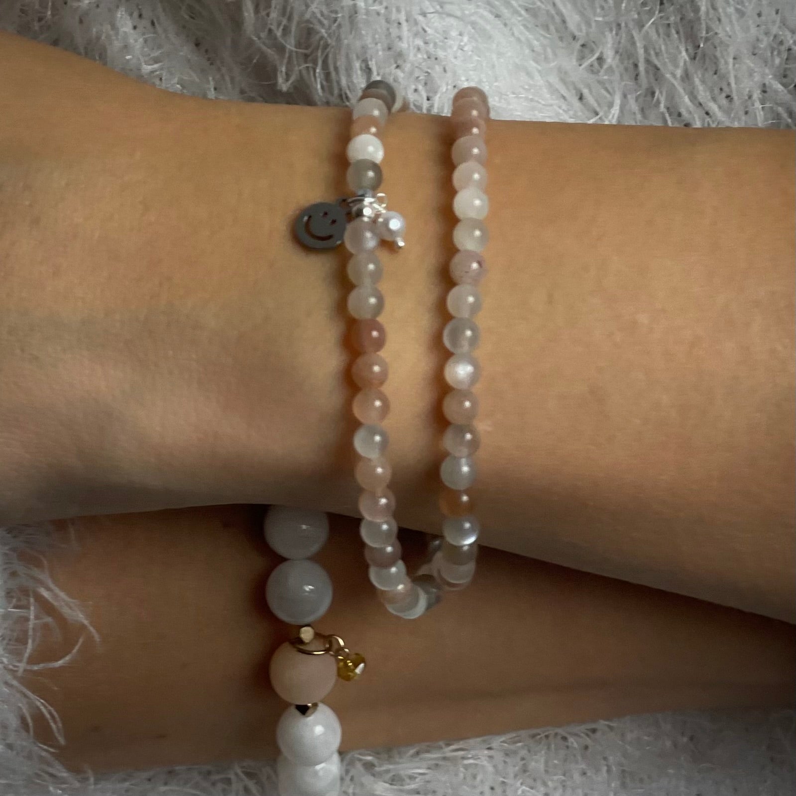 -Armband Mondstein "Ausgeglichen S(t)ein" doppelt mit 4 mm Perlen und zwei Anhängern